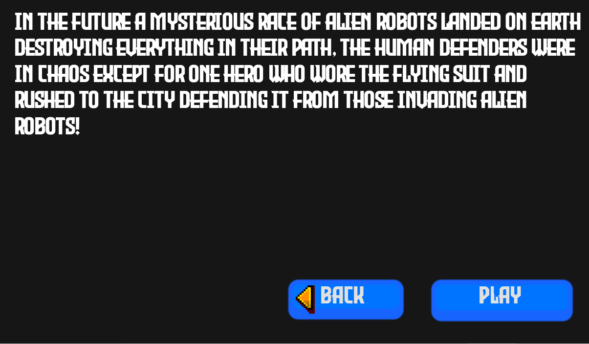 In the future a mysterious race of Alien Robots landed on earth destroying everything in their path, the human defenders were in chaos except for one hero who wore the flying suit and rushed to the city defending it from those invading Alien Robots!